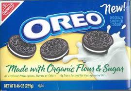 The reason there are more calories etc. in organic food options is due to the fact they do not substitute any ingredients with harmful chemicals. Which in turn regardless of the amount of calories, fat, etc. makes organic the better choice. Do not be fooled by labels though, like the one on the oreos above, Just because the label says organic, unhealthy processed oreos are NOT healthy no matter what you try to convince yourself of.